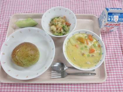 抹茶パン サマーシチュー ごまみそドレサラダ メロン 牛乳