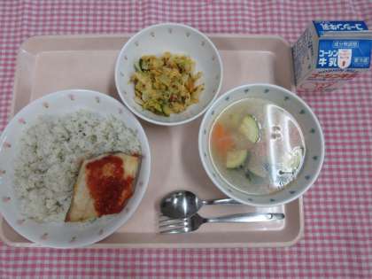 ガーリックライス 牛乳 さばのムニエルトマトソース かぼちゃとツナのサラダ ズッキーニのスープ