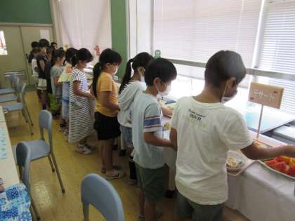 3年1組のバイキング給食でした!今回は家庭科室での実施です。理由は・・・実はランチルーム、クーラーがないのです!!暑いと食欲が落ちてせっかくのバイキングが楽しんでもらえない!と急遽家庭科室に変更しました。その甲斐あってか、最初はたくさん残っていた料理も、終わる頃にはからっぽでした!