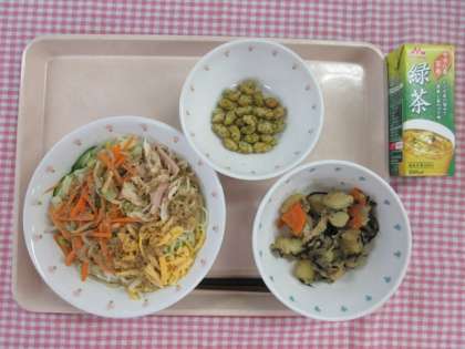 冷やし中華 お茶 じゃがいものひじき煮 大豆の磯辺揚げ