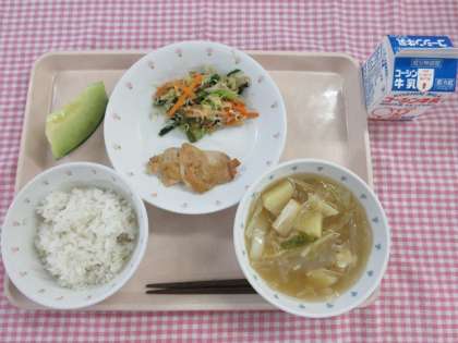 ごはん 牛乳 鶏肉のねぎみそ焼き しらすのさっぱり和え くずきり汁 メロン