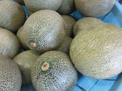 果物のメロンはたかみメロンという種類です。見た目はだ円形をしていて、メロン特有の皮についている網目は細かく、食べると果汁がたくさんふくまれていて、甘味や香りも強いことが特長です!