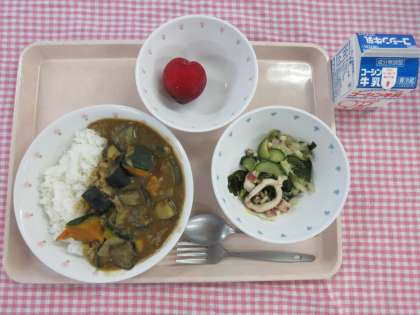 夏野菜カレー 牛乳 シーフードサラダ プラム