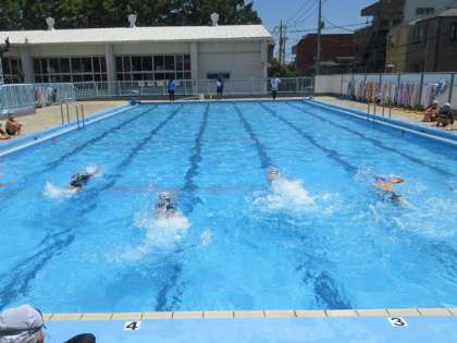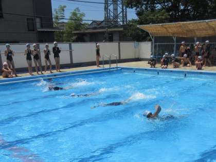 夏休み明けの9月1日に区の水泳大会があり5年生が出場します。その目標に向けて、今日は5年生がプールで練習に励みました。自分の種目だけでなく、応援のかけ声にも磨きをかけました。