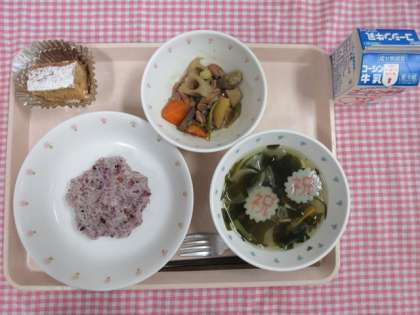 桜ごはん 牛乳 筑前煮 おすいもの きな粉ケーキ