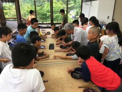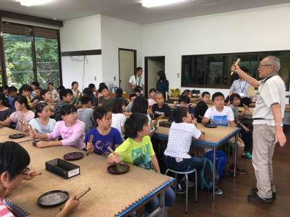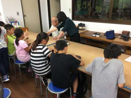 宿舎から歩いて、日光彫の体験にやってきました。めあての5分前集合も全員や達成し、子供のやる気の充実を感じます。講師の先生の話をよく聞いて、これから体験をします。