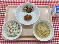 ゴーヤが入った豆腐の炒め物です。チャンプルーは「ごちゃまぜ」という意味があります。ゴーヤの苦さを取るために、給食では白い綿の部分をしっかり取り(この部分が苦いのです!)、塩もみして下茹でしてから使用しました!