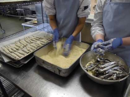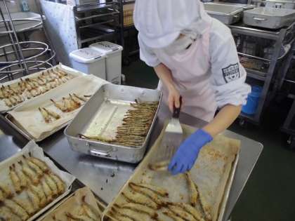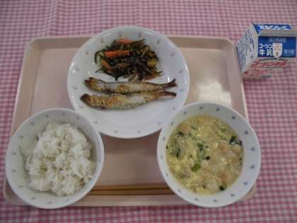 ししゃものさざれ焼きは酒をふったししゃもにマヨネーズを塗り、パン粉をつけて焼きました!鮭で出すことが多いメニューですが、ししゃもでもフライのような食感で食べやすくなります☆