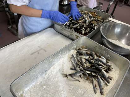 豆あじのからあげは,子供たちの食べやすいように2度揚げしていただいています。
