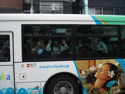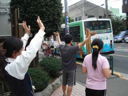 渋滞で遅れていたバスが到着し、いま、6年生が出発しました。