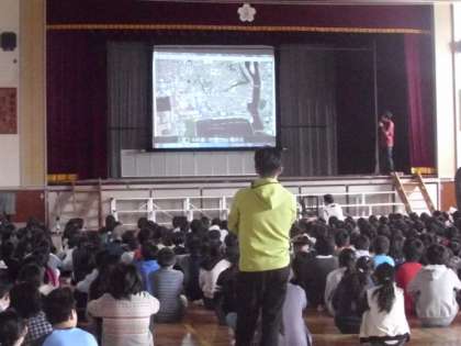 今日の全校朝会では震災時の様子などについて、石巻市出身の教員が話をしました。