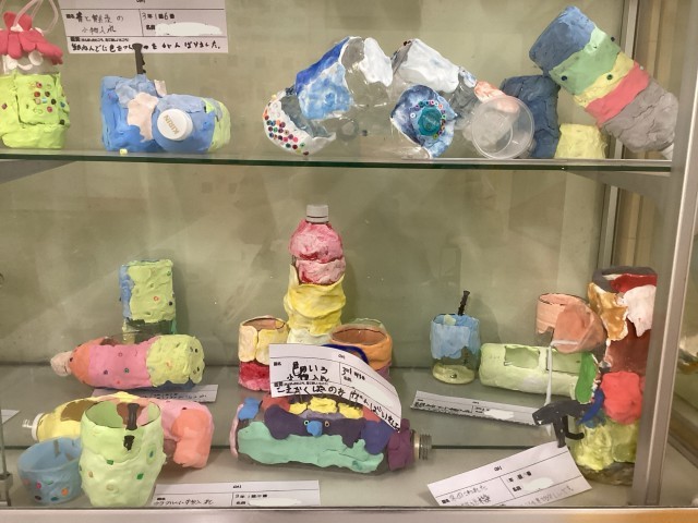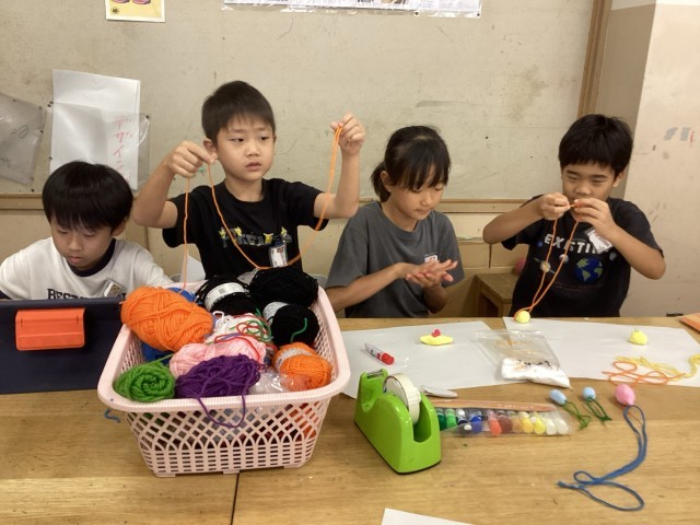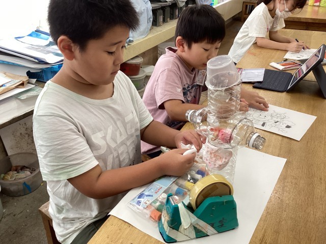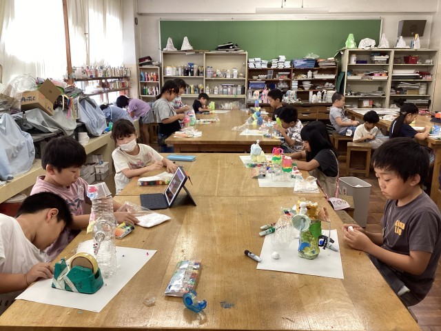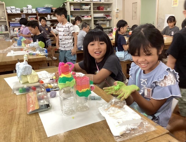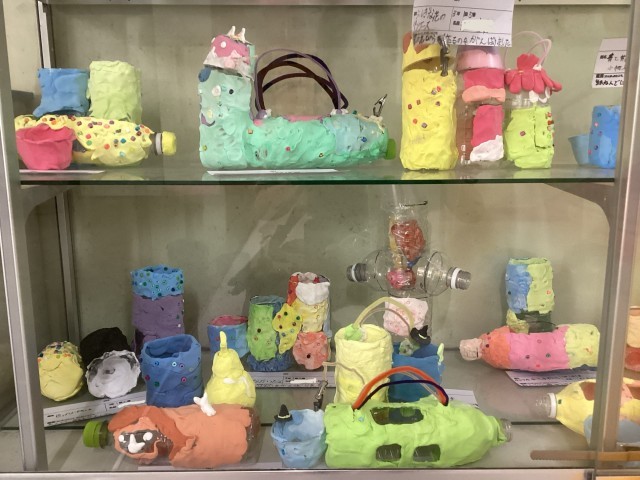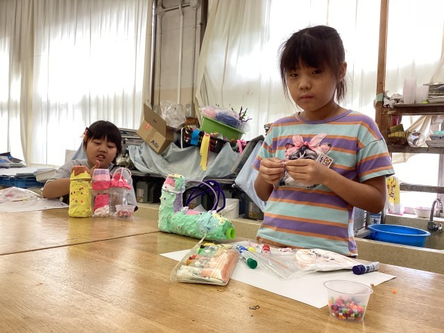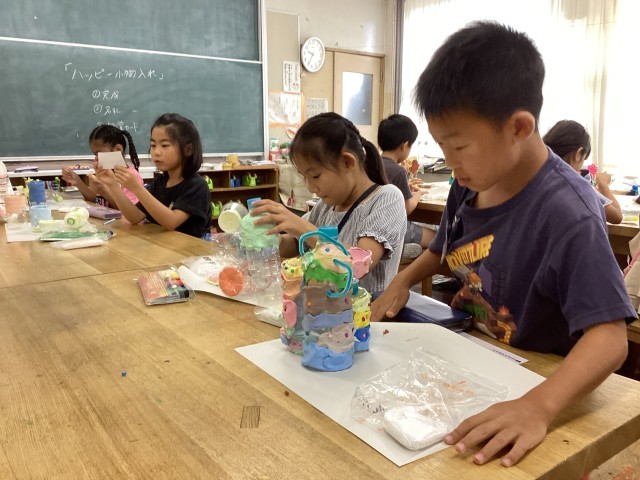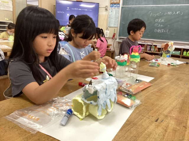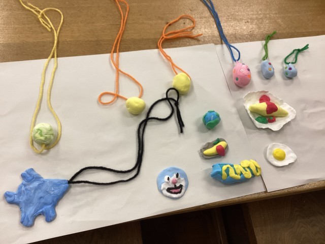 ペットボトルの組み合せを考えて、形を作りました。紙粘土に絵の具を入れて、色を着けました。紙粘土が柔らかい時に、モールやアイロンビーズ等を使って、装飾を工夫しました。3年生らしい、使って楽しい小物入れが完成しました!!余った紙粘土で、お母さんに贈るペンダントやオムレツ等、自由に好きなものを作りました♪
