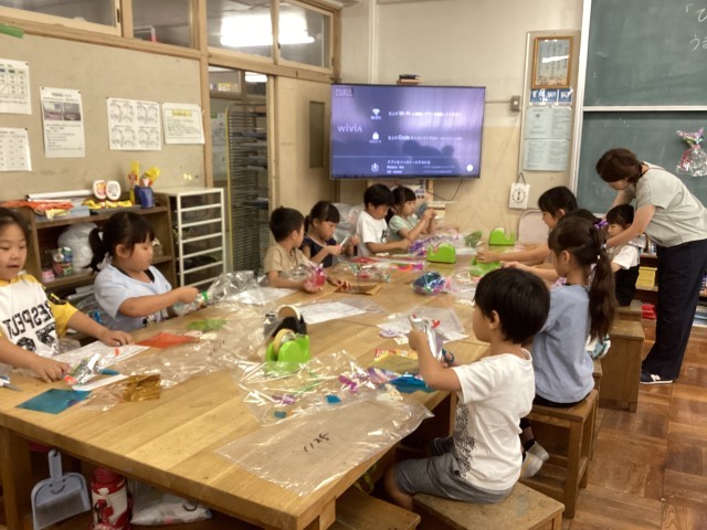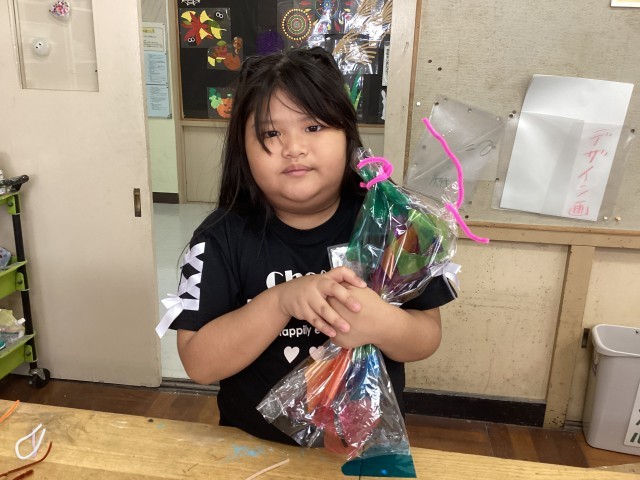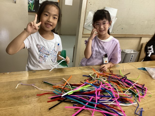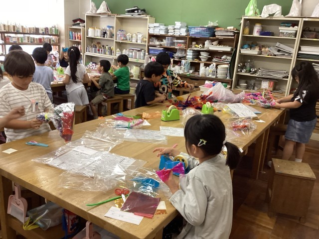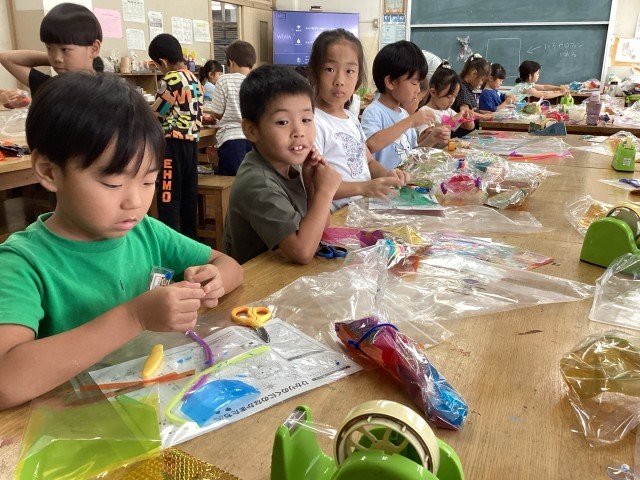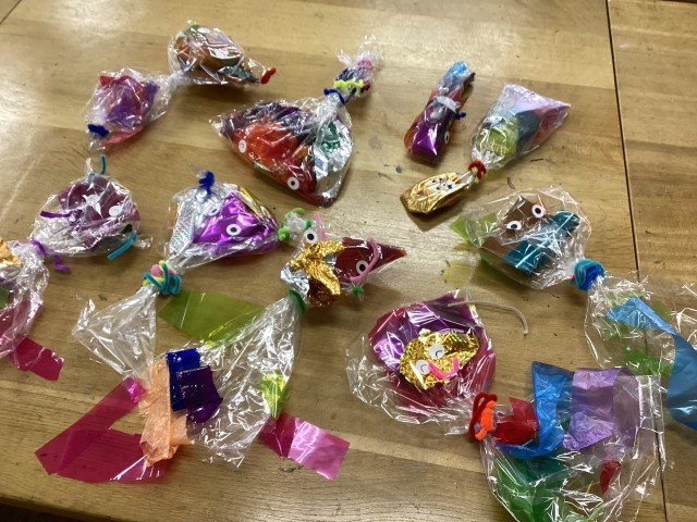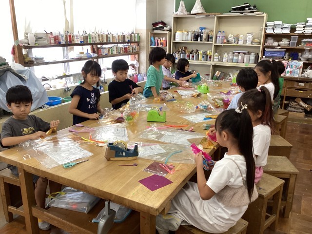 透明のビニールの袋の中に色セロファンを入れて、犬やクジラなど、自分のイメージに合わせて形を作りました。色セロファンを丸めたり、切ったりして、工夫して作品の装飾をしました。耳や首の部分等は、モールを使って作りました。光を通す色セロファンの特徴を生かし、楽しく作ることができました♪