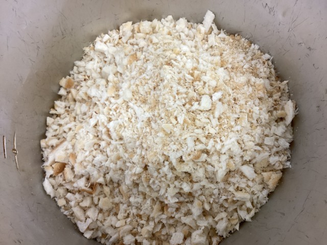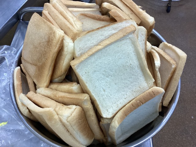 また、パン屋さんから捨ててしまうパンの耳の部分を無料でいただき、給食室でパン粉にし、衣付けしました。