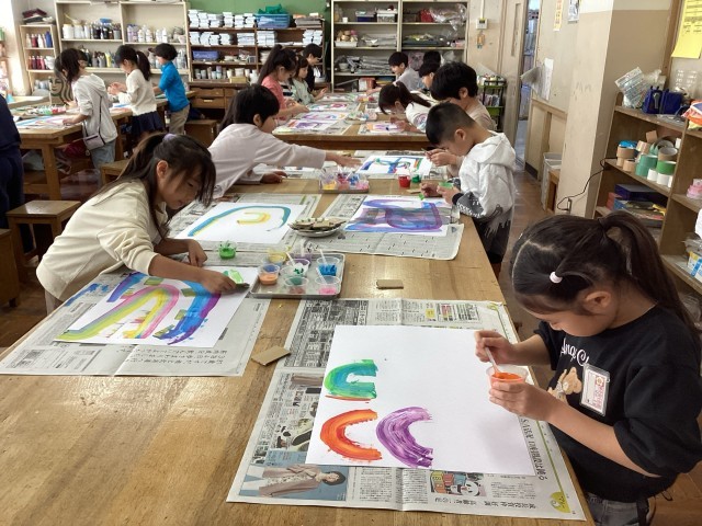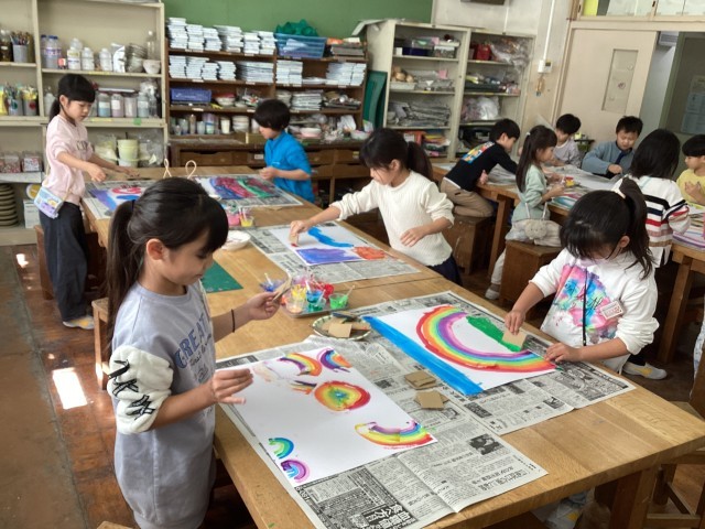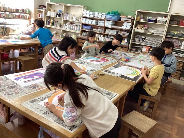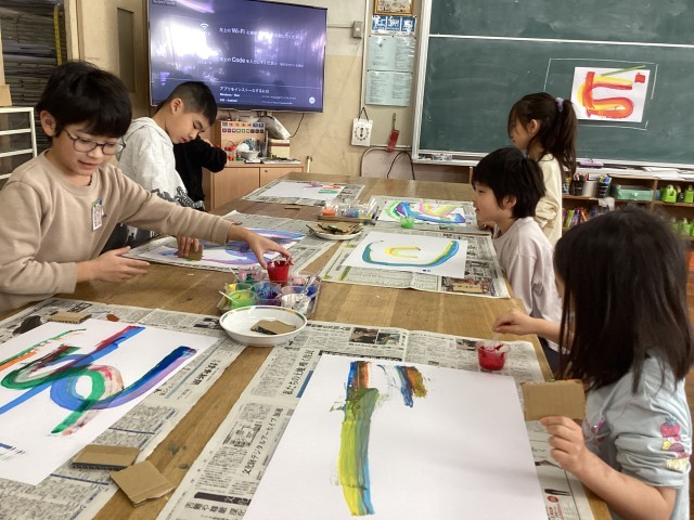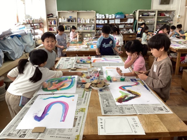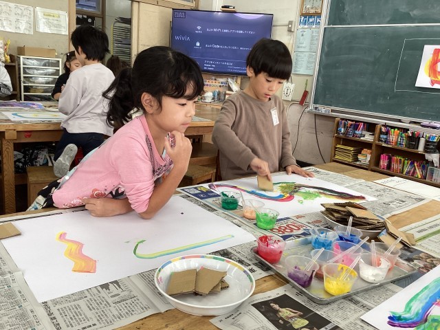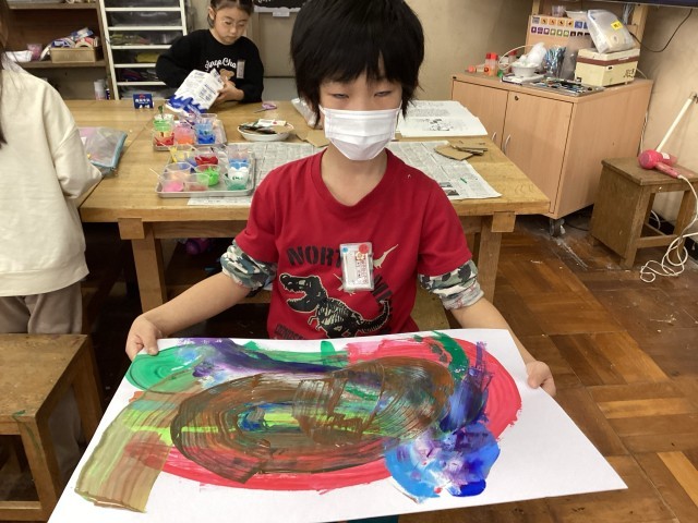 画用紙の上に絵の具を置いて、手の大きさに合わせた段ボール使って、絵の具を伸ばして引っ張りました。絵の具は、子供たちによって、どこまでも自由な形になります。色を変えたり、何枚も段ボールを使ったりして、子供たちは、のびのびと思うままに制作していました。