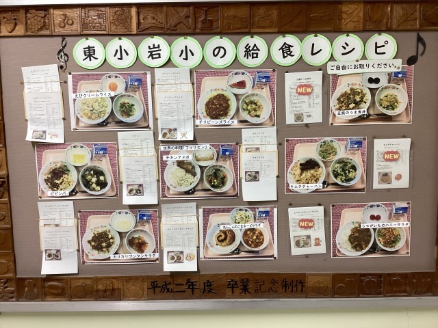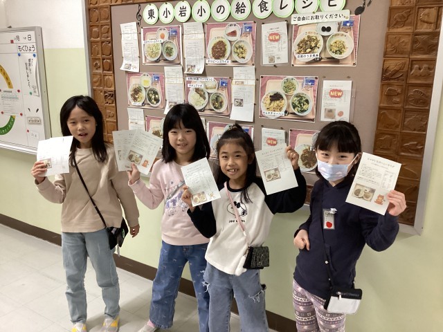 先月の学校公開に合わせて、職員室前の掲示板で給食レシピを配布しています。昨日は、2年生から「レシピが空っぽになっているので、補充してください!」と声をかけられました。補充すると早速中休みにレシピを貰いに来てくれました。学校の給食レシピからご家庭の食育に繋がるようにへ今学期は、続けていきたいと思います。