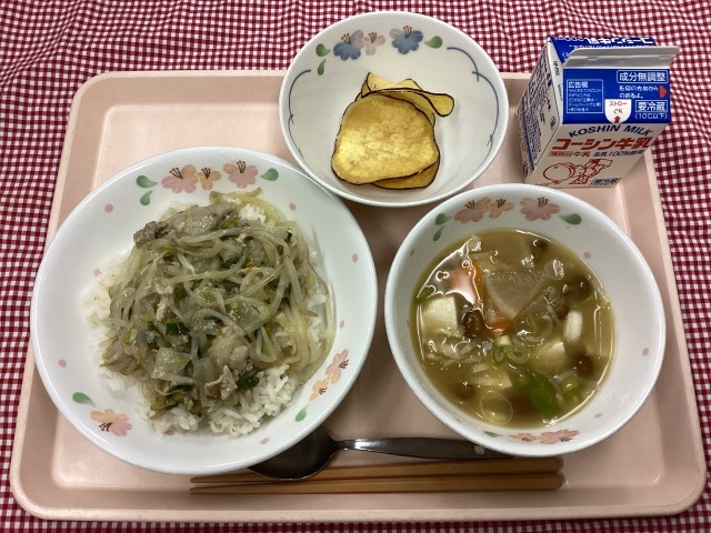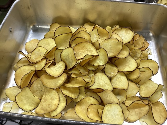今日は、給食新メニュー「さつまいもチップス」でした。170度で7分じっくり揚げました。