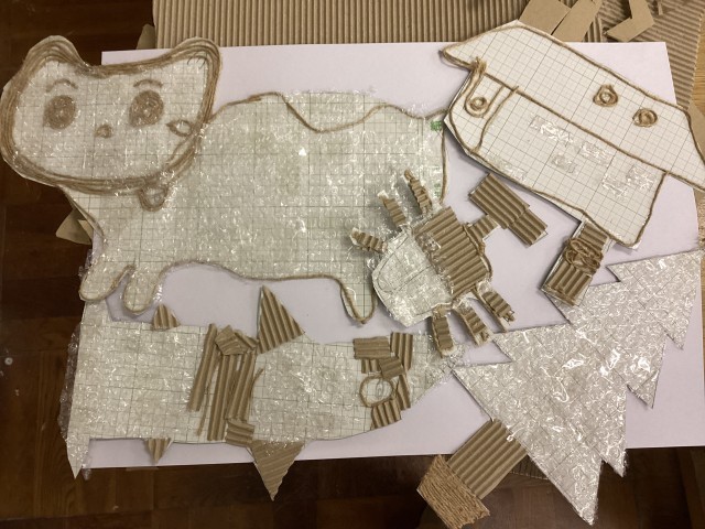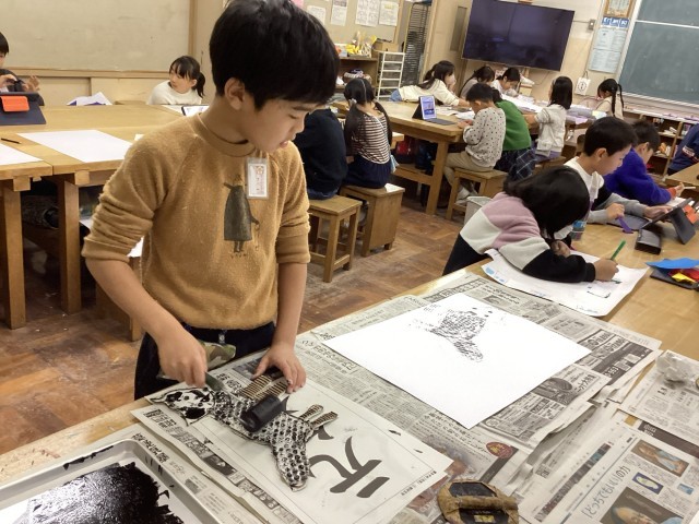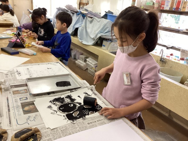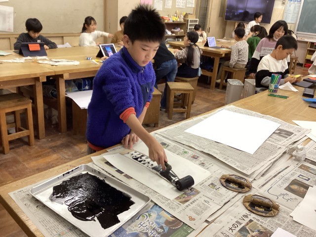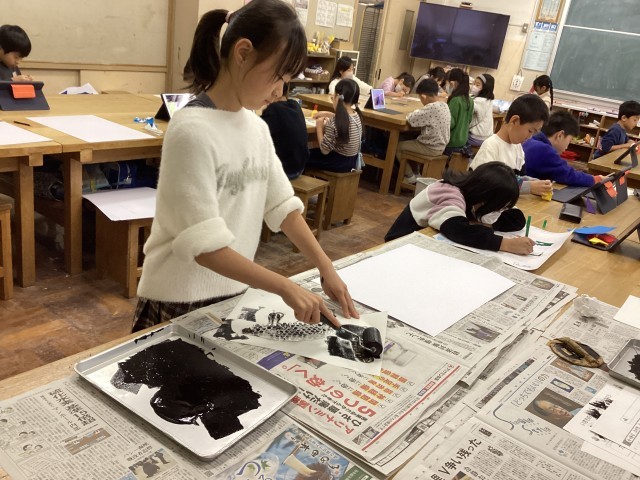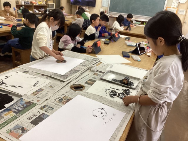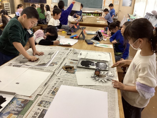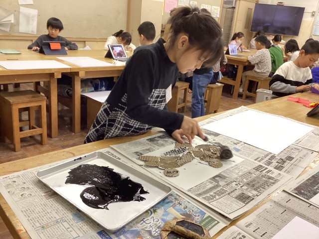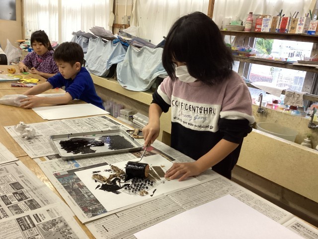 版画の版を、エアーパッキンや麻のヒモ等を使って作りました。版画の道具、ローラーやバレン等を初めて使い、一生懸命取り組んでいました。