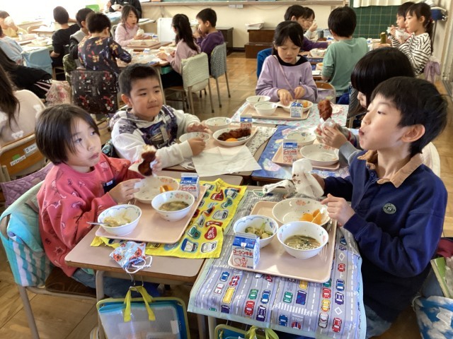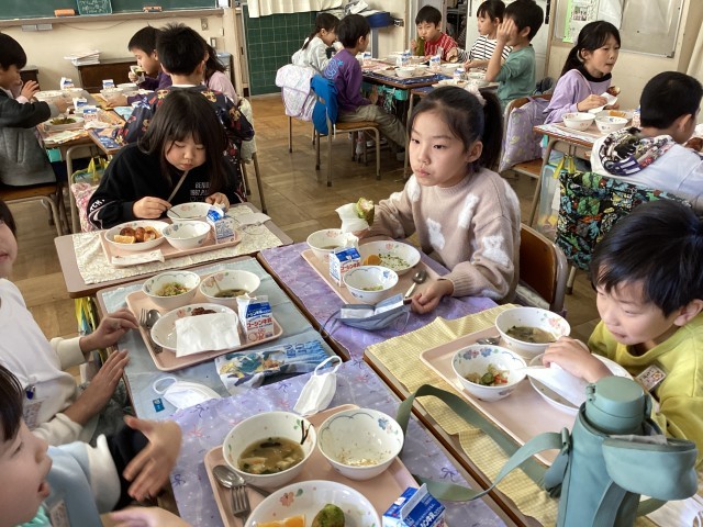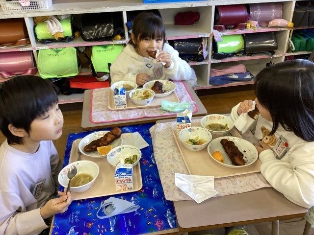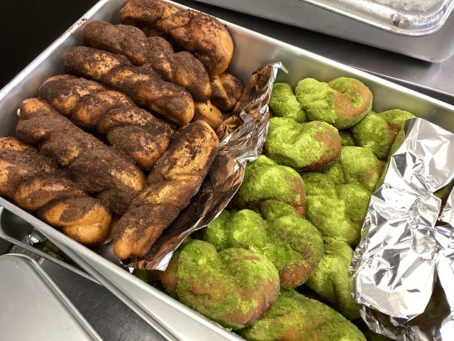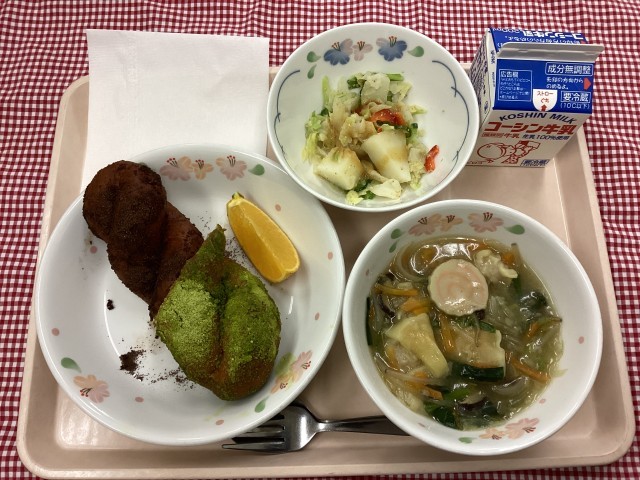 今日は、第2回セレクト給食の日です。主食の揚げパンの味を選びます。味は、給食委員が考えました。「抹茶きなこ」か「ココア」です。抹茶きなこが142人、ココアが211人で、ココアが人気でした。でも、「抹茶きなこ味は、学校でしか味わえないから」と選んでいる5年生もいました。口の周りに茶色のココアや緑色の抹茶をつけて頬張って食べている様子が微笑ましかったです。