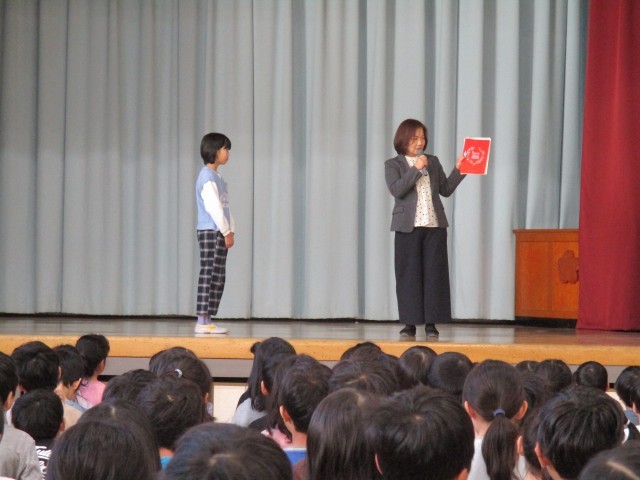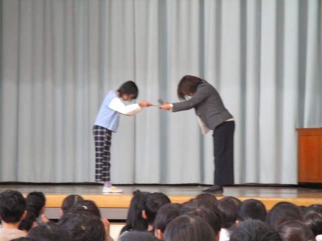 本日の朝会では、夏休み中の自由課題(写真コンテスト)に出品した児童の表彰がありました。
