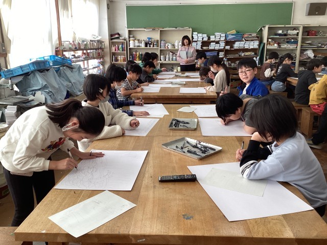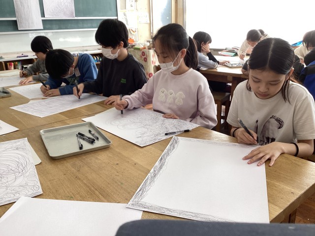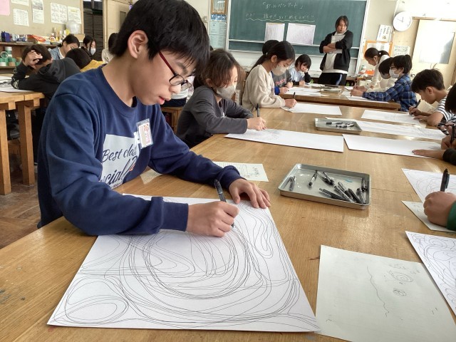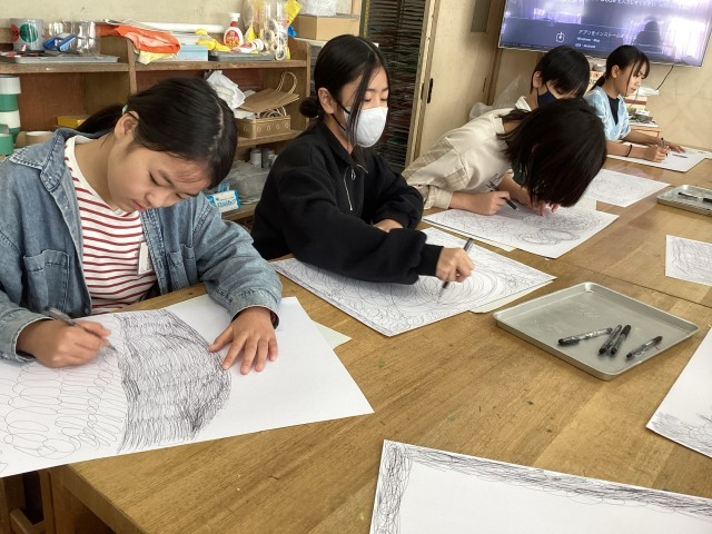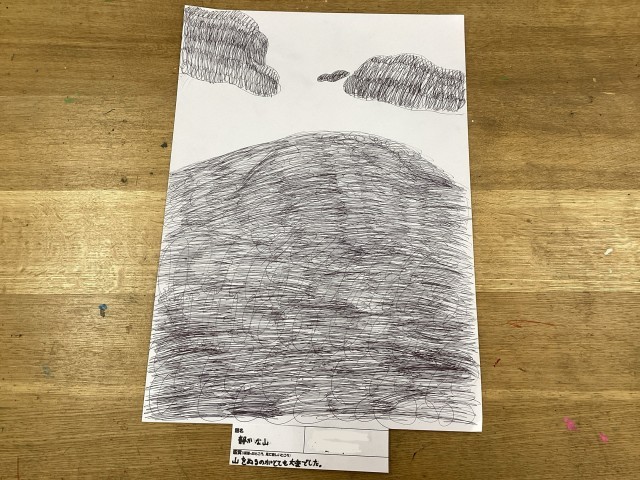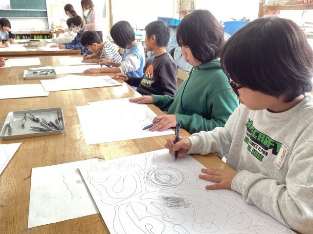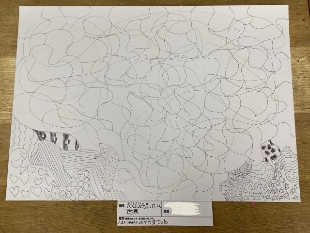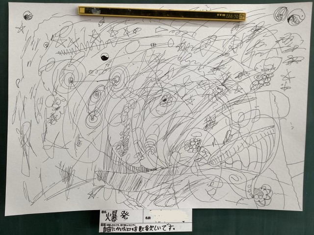 ボールペンを使って、自分の表したい形を描きました。初めは、使い慣れないボールペンに戸惑う場面もありましたが、「ザッーザッー」「コツコツ」と音を立てながら意欲的に制作していました。自分らしく、思うままに描くことが出来ました。