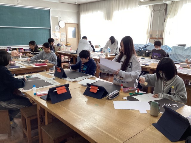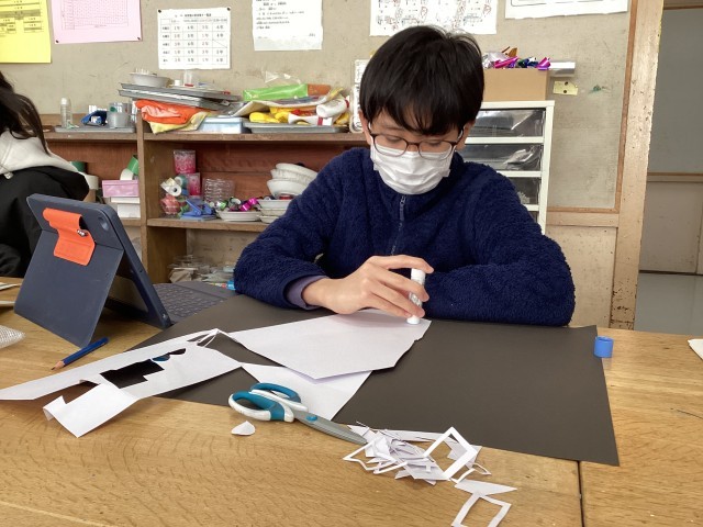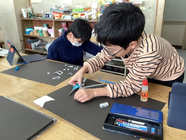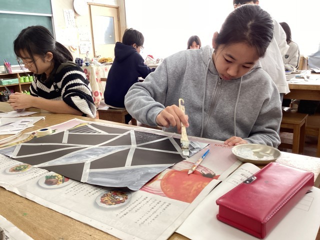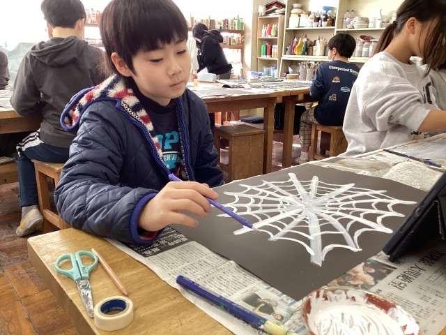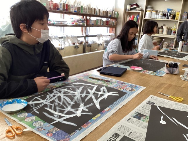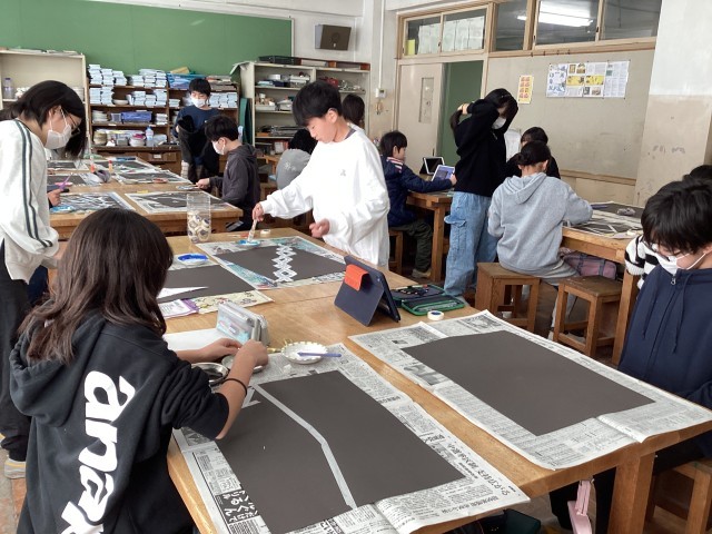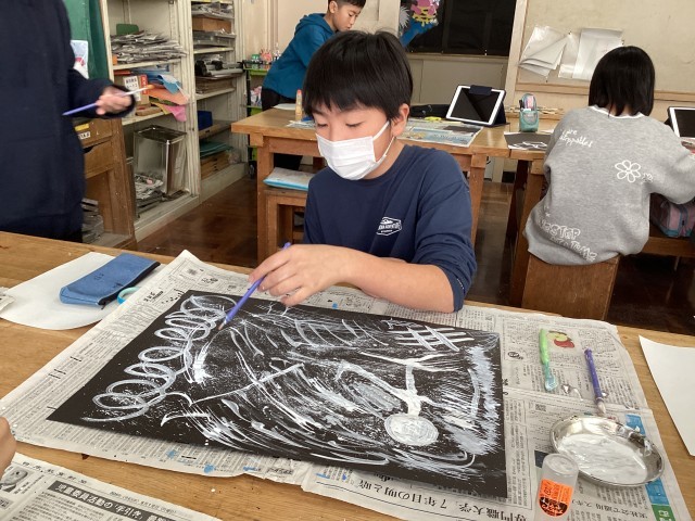 白、黒、グレーの3色を使って作品を作りました。絵の具や歯ブラシ、マスキングテープなどの道具を使って、自分の思いを色と形に表現しました。筆やマスキングテープで線を描き、歯ブラシを使って絵の具を飛ばす!6年生ならではのテクニックです♪