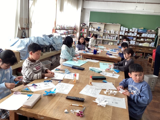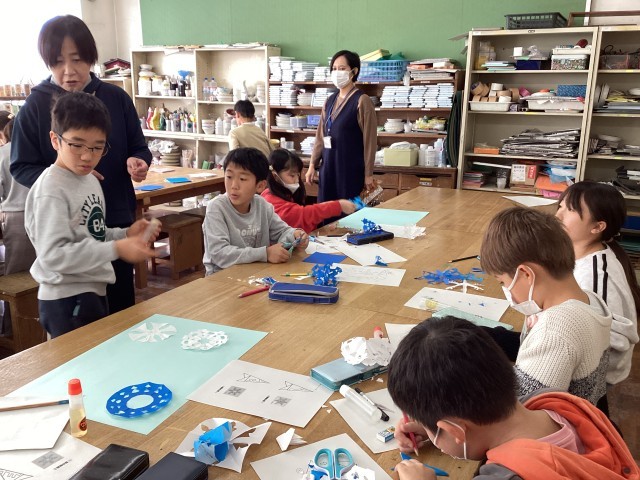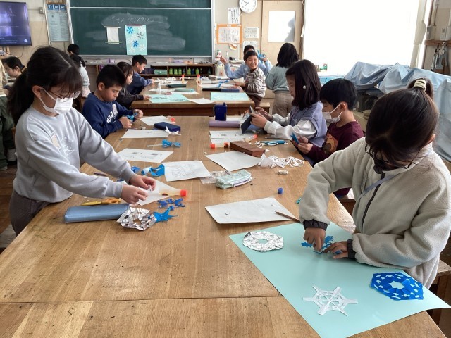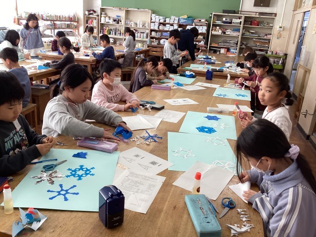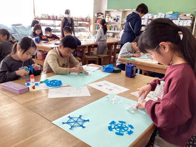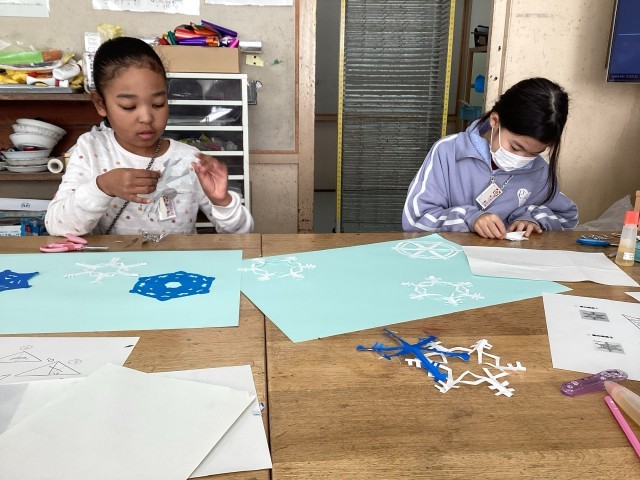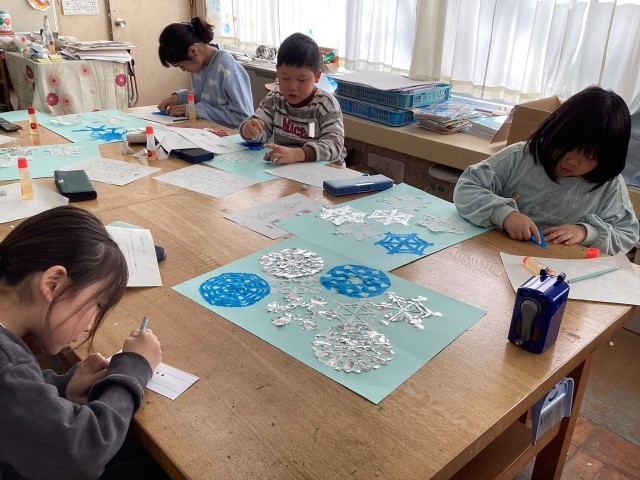 折り紙を丁寧に折って、はさみで切って、雪の結晶を作りました。はさみの使い方に気をつけながら、色々な所に、はさみの切り込みを入れます。「どんな形になるのかな?」ドキドキしながら、ゆっくり開く瞬間が楽しみです♪色々な形の雪の結晶を組み合わせて貼ったら完成です。