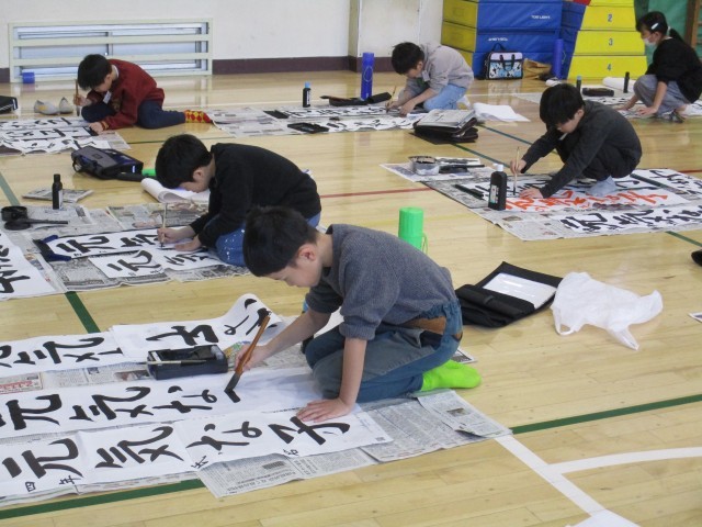 1月9日、13日に書き初め大会を行いました。1・2年生は教室で硬筆の書き初め、3年生以上は体育館で毛筆の書き初めです。