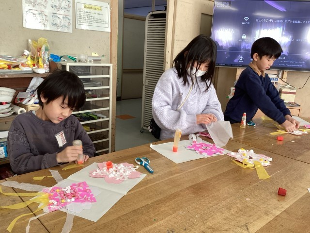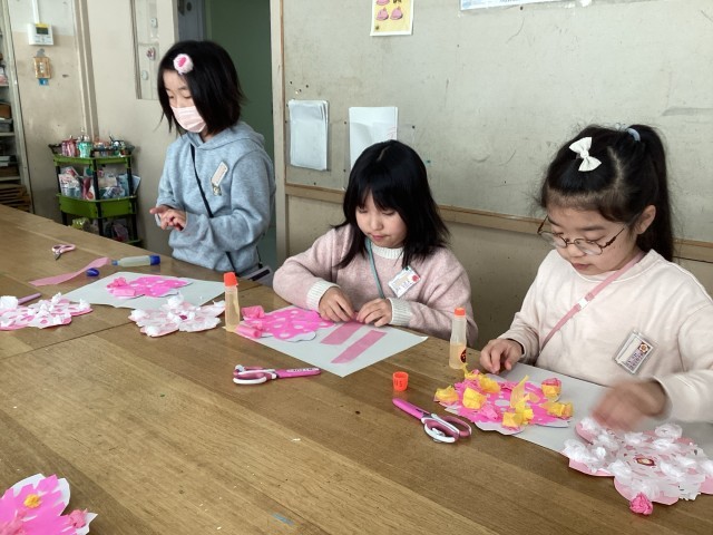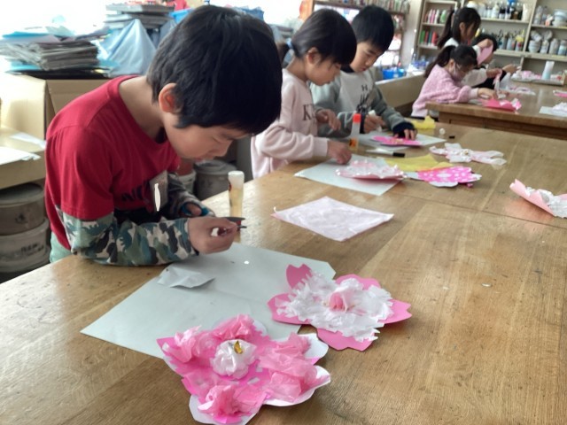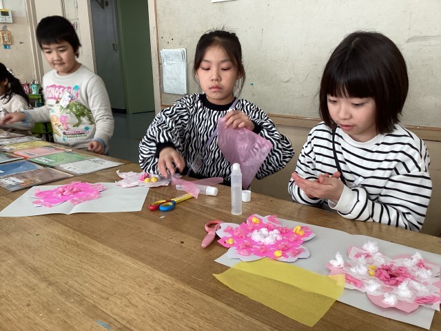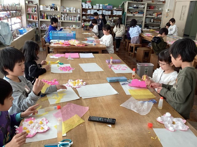 毎年、2年生〜5年生が、卒業式・入学式へ向けて「おめでとうの作品」を作ります。折り紙を何回か折ってはさみで切って開き、お花紙の使い方を工夫して、桜の花びらの紙に装飾しました。今までの経験を活かし、自分の表したい色や形を表現しました。学校内が桜満開になる日をお楽しみに♪