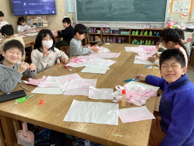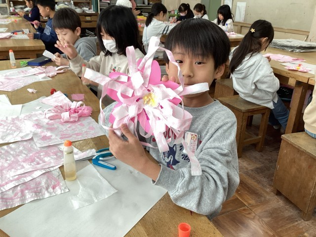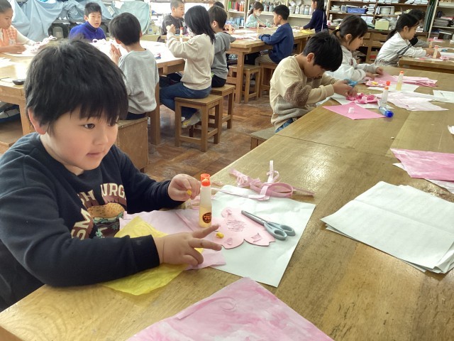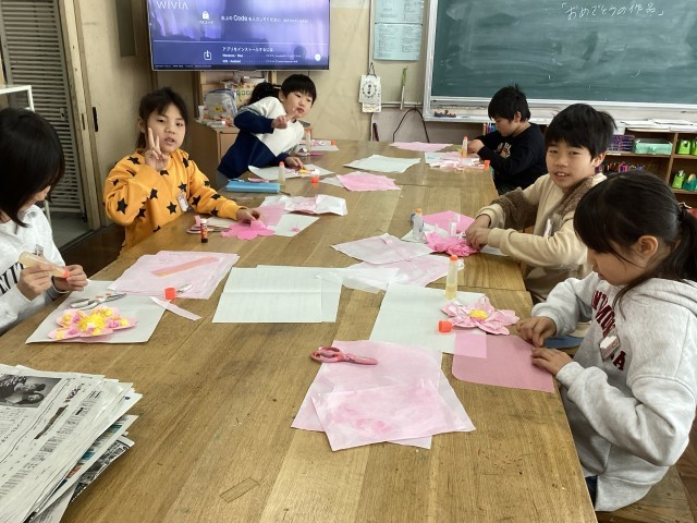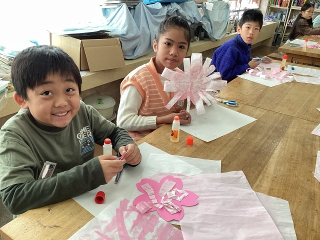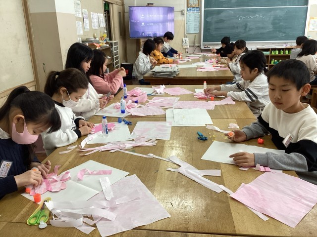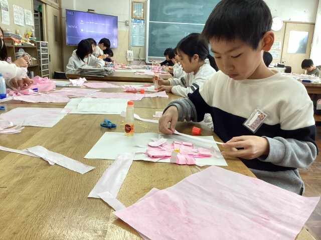 先週、さくらをイメージしながら、半紙にピンクの絵の具を塗りました。今日は、桜色に染まった半紙を丸めたり、ちぎったりして工夫しながら桜の花びらにしました。自分の表したい桜を思い描きながら、集中して制作しました。