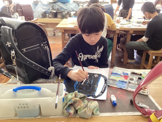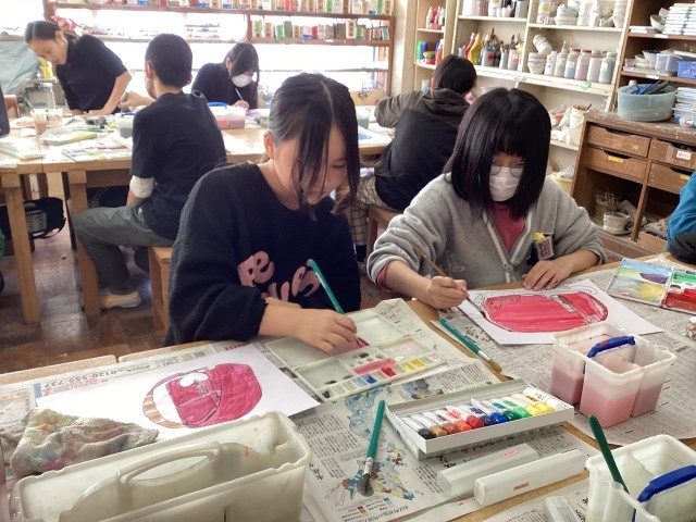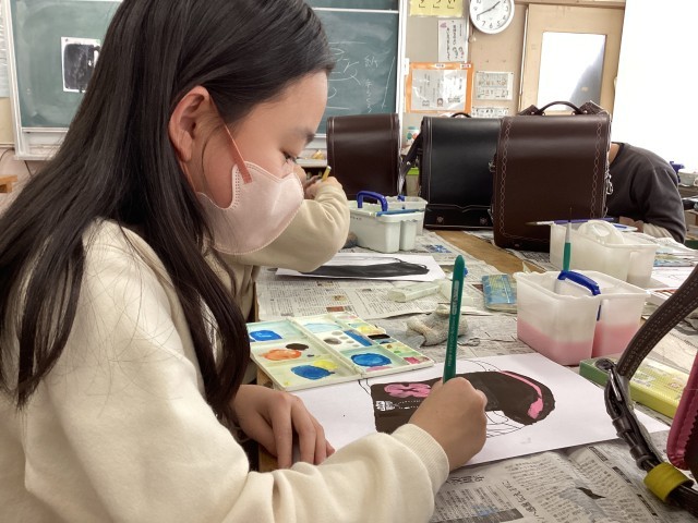 先週、鉛筆で下書きをしてから、墨で描きました。今週は、絵の具を使って色を塗りました。絵の具を混ぜて色を作ったり、水分調整をして濃淡を付けました。今週も集中して取り組んでいました。地域や商店街に飾られる日が楽しみです。