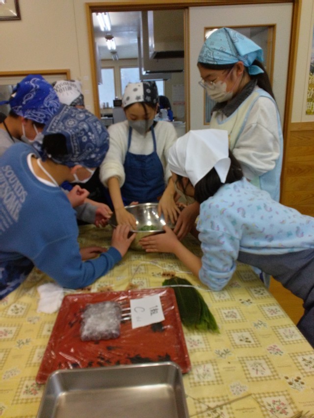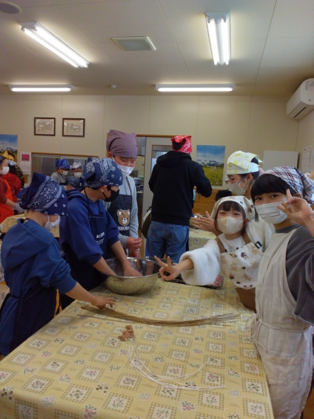 バスで移動して、笹団子作り体験が始まりました。まずは粉にヨモギの汁を入れて練ります。