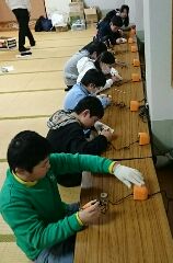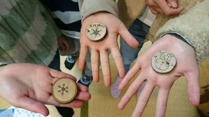 輪切りの木片に電熱ペンで好きな絵を描きました。
