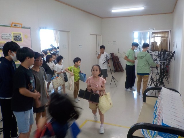 休み時間の音楽室は、学習を終えた1年生を見送って金管の自主練習をする6年生が入っていきます。自分たちで「やろう!」と決め、さらに伸びていきます。