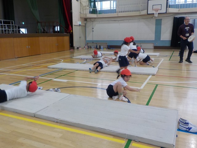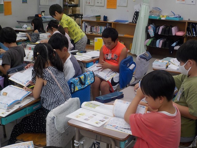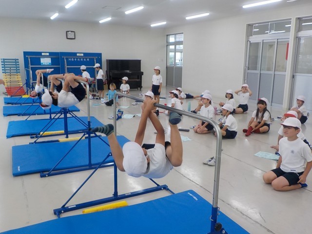 プレイルームで鉄棒をする2年生、体育館でマットを転がる1年生、そして国語辞典で言葉を探す3年生。校内のいろいろな場所で、楽しく学習に向かうかみっ子です。
