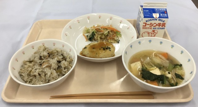 今日の給食は、小松菜一斉給食です。江戸川区の小・中学校に、小松菜農家の方から無料で小松菜が届けられました。これは、江戸川区の特産品である小松菜を知ってもらい、地場産業について理解を深めてほしいという取り組みです。
