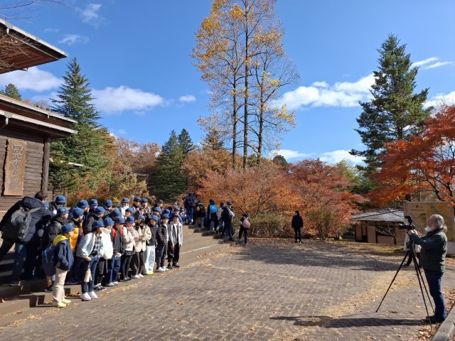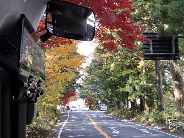 真っ赤に染まる「紅葉の杉並木」を通り、木彫りの里に着きました。