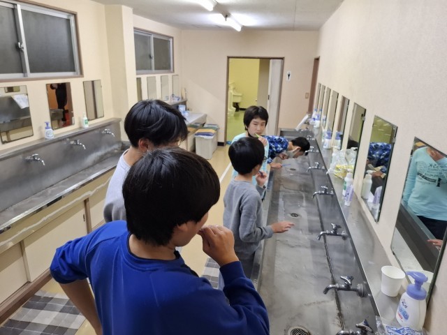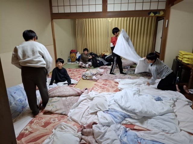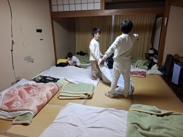 布団をしく向きも、それぞれの部屋の考えで。頭を寄せ合ったり、縦横を考えたり…。早くも眠たそうな子もいます。