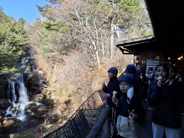 日光の紅葉中継でも頻繁に取り上げられる「竜頭ノ滝」ですが、紅葉の終わった今は閑散と。子供たちは楽しみなソフトクリームを手に、滝の鑑賞です。