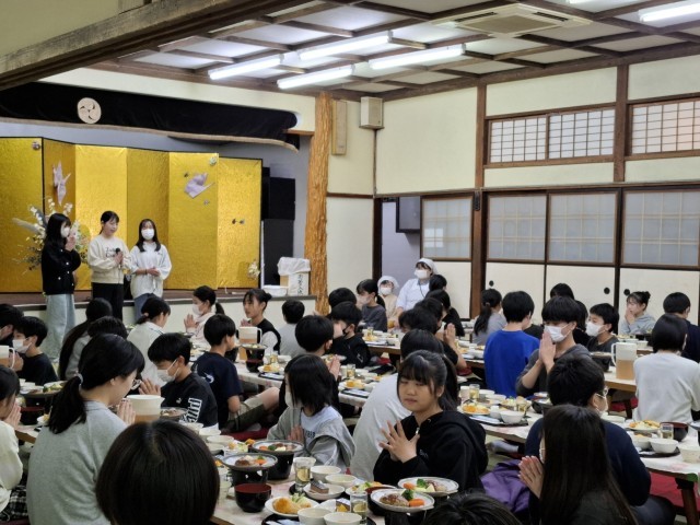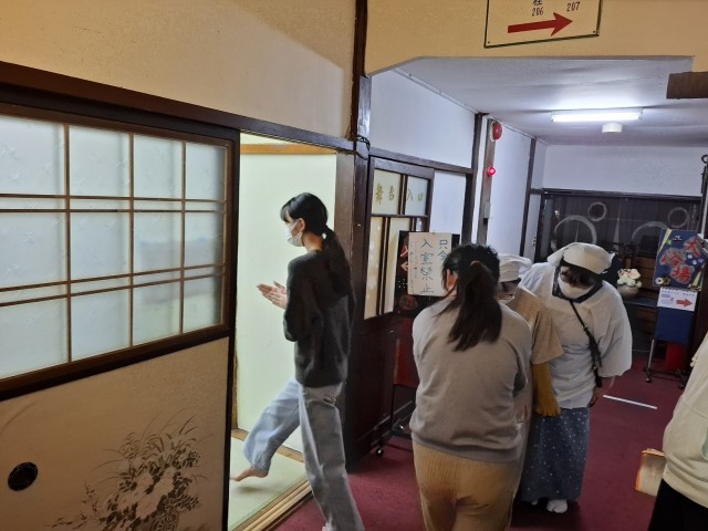 「お帰りなさいませ」と、食堂に入る前にアルコールを手にかけてくれるのは、梅屋敷旅館の「若女将」(豆女将)です。朝食のお手伝いの後に小学校に登校し、下校後には夕食のお手伝いです。お二人の笑顔で、ご飯の味わいも倍増します。