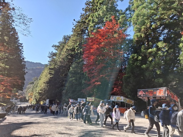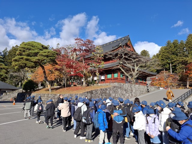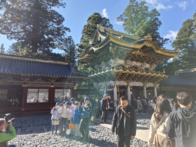 輪王寺の大伽藍に「すげぇ」の声も聞こえましたが、3日目も素晴らしい青空で、日光山内の朱色や金がよく映えます。