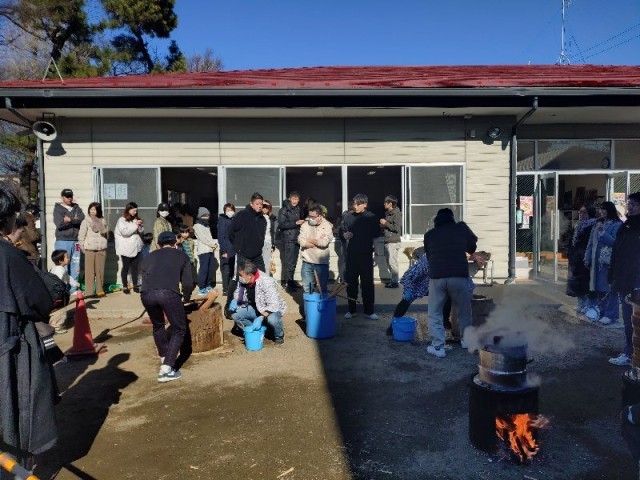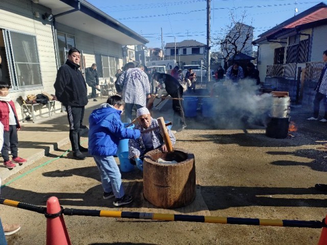 六東自治会館前で、恒例の新年の餅つき大会、正月遊びがありました。