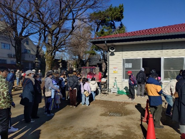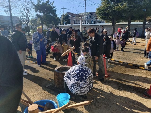 地域の子供たちがたくさん集まり、つきたての「あんこ餅、きなこ餅」や「わたあめ」をいただきました。また、羽つきやこま回しといった正月遊びを楽しむこともできました。