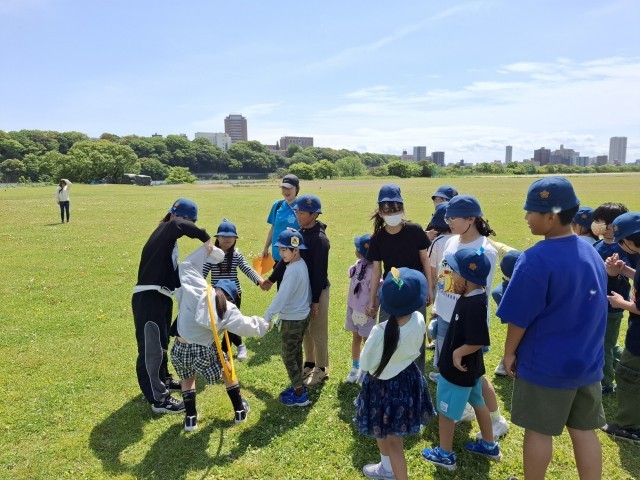 踊り、歌い、フラフープをつなぎます。みんな楽しそう!
