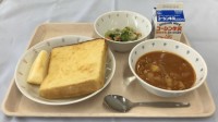 ・手作りコーンチーズパン・鶏肉とマカロニのクリームスープ・ひよこ豆サラダ・牛乳