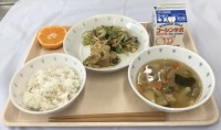 ・ごはん・厚揚げの肉みそかけ・小松菜とキャベツの炒め物・いろどり汁・みかん・牛乳