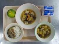 今日の給食ごはん・じゃことおかかのふりかけ・豚肉と大根の含め煮・かぶのみそ汁・果...