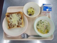 今日の給食ピザトースト・牛乳・ABCスープ・さつまいもの甘煮 今日はさつまいも...