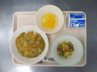 今日の給食チキンカレー・牛乳・ごぼうチップスサラダ・フルーツ寒天 今日から令和8...