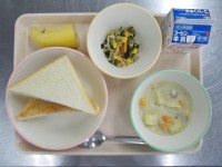 今日の給食ジャムサンド・牛乳・ツナサラダ・コーンチャウダー・果物:バナナ 今日は...